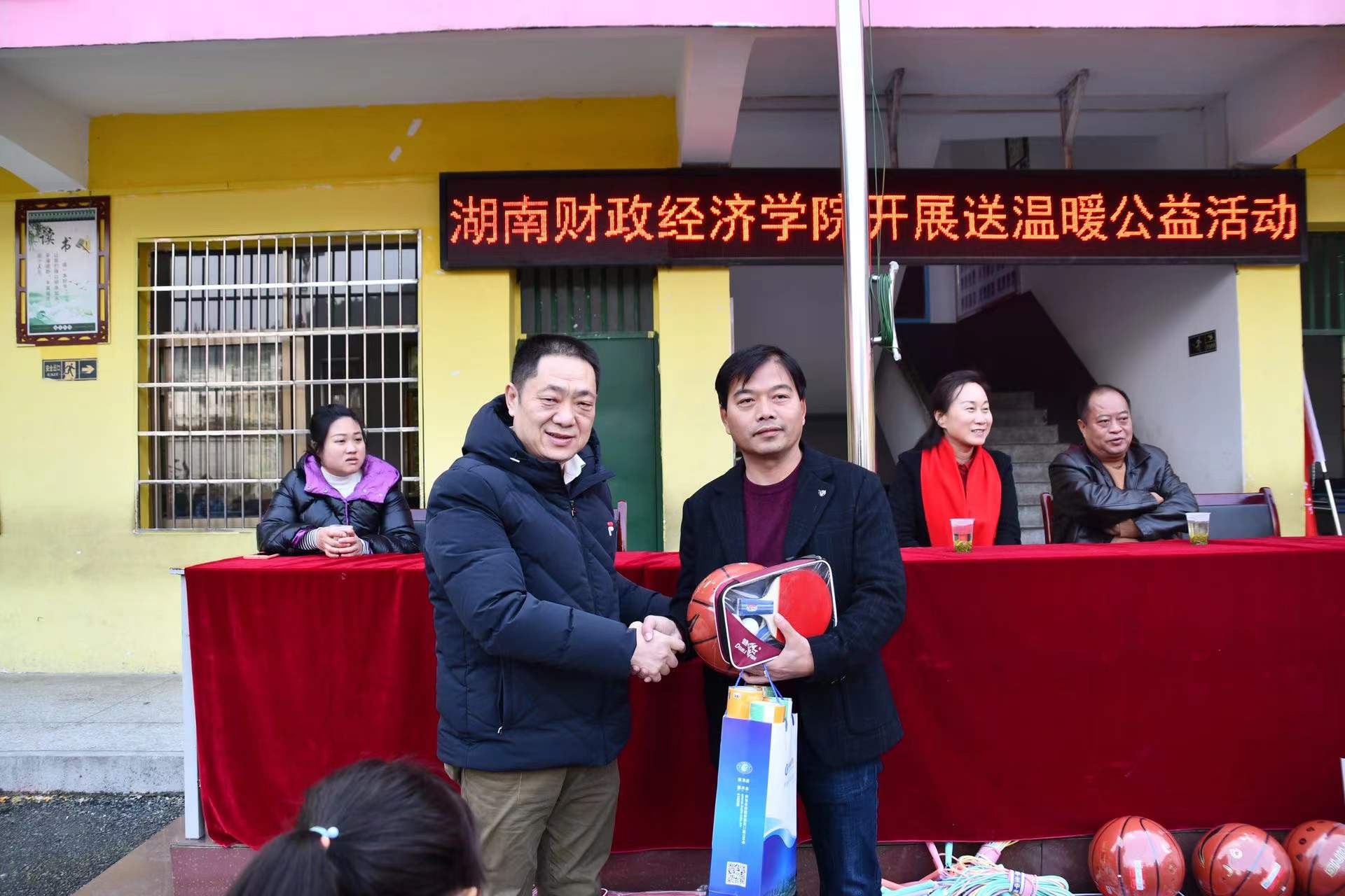 1月11日,best365中国官方网站党委书记肖湘愚、副校长苏玲一行赴常宁市塔山瑶族乡狮园完小,将一批由雷锋学院全体学生亲手编织的红围巾和体育用品送到该校学生手中,让他们在寒冷的冬天感受到融融暖意。