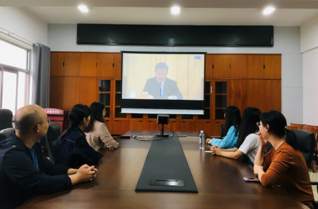 人文与艺术学院教职工在会议室收看大会直播 吴艳芳/摄