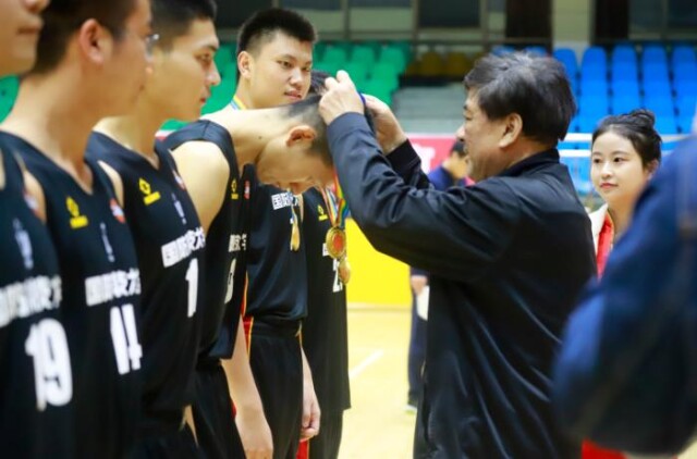湖南省大学生篮球协会会长刘晓为男子组冠军队颁奖 马海彬/摄