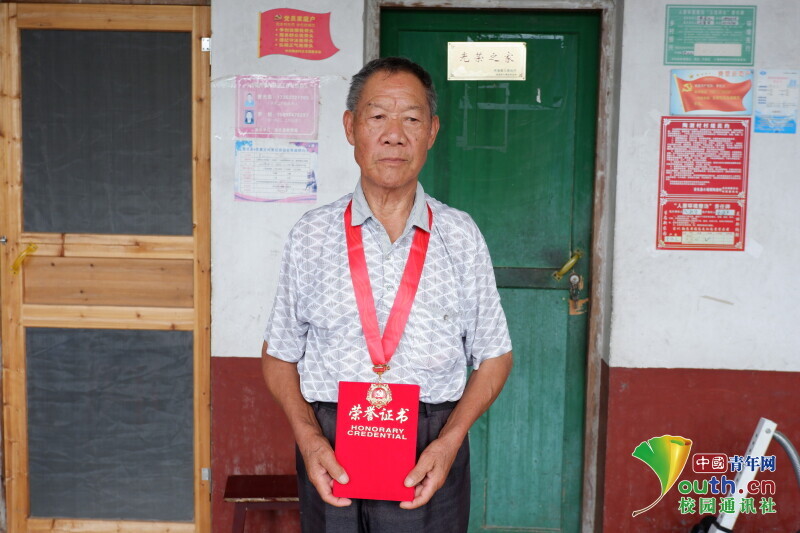 图为老党员李化之与光荣在党50年的徽章合影。中国青年网通讯员 陈星语 摄