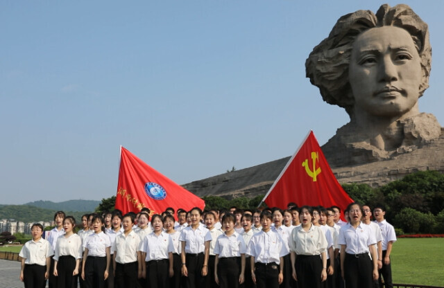 60名新党员代表胸前佩戴党员徽章,整齐地列队在橘子洲头毛泽东青年艺术雕塑前。面对党旗,举起右手,在肖湘愚的领誓下,表达对党的忠诚和为共产主义事业奋斗终身的决心。