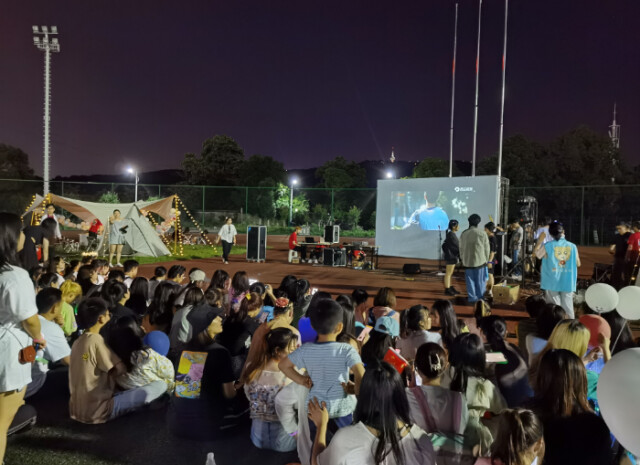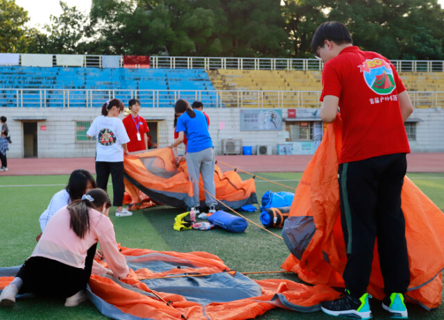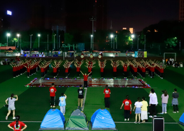 活动最后,大家在操场上临时搭建的荧幕前一同观看了红色电影《建党伟业》。直至观影结束,大家收拾物资,关闭全场灯光,入帐休息。