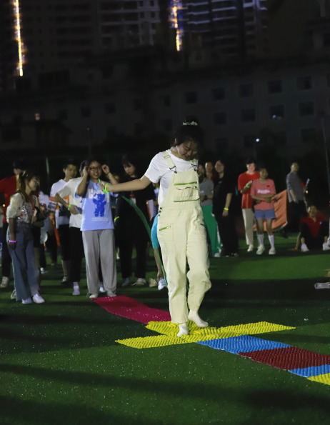 游戏环节围绕“红军长征”主题,以生动有趣的形式开展党史教育。学生分组开展主题拓展活动,在“不怕远征难”——达芬奇密码、“草鞋过草地”——指压板接力跑、“飞夺泸定桥”——隔空取水、“血战独树镇”——动力圈四个游戏中体验红军长征的艰苦历程。