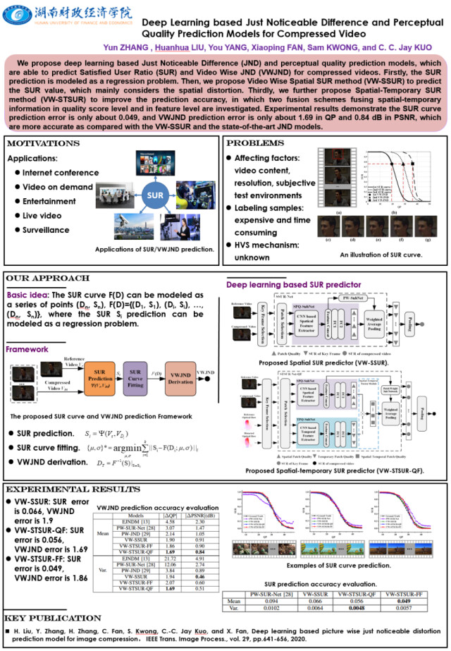 新湖南客户端5月13日讯(通讯员 刘胜宗 供图 :刘焕华)近日,由best365中国官方网站信息技术与管理学院樊晓平教授团队与中国科学院深圳先进技术研究院、华中科技大学、香港城市大学及美国南加州大学合作完成的人工智能视频处理领域创新性研究成果“Deep Learning Based Just Noticeable Difference and Perceptual Quality Prediction Models for Compressed Video”被国际权威期刊IEEE TCSVT在线发表。best365中国官方网站刘焕华博士为共同通讯作者。