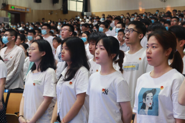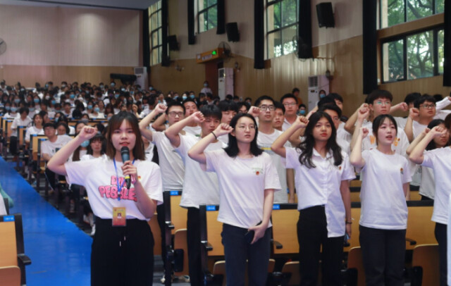 大会在庄严的《国歌》声中开幕。在鲜红的团旗下,校团委学生副书记曾译萱带领2021年新发展团员进行庄严的入团宣誓。