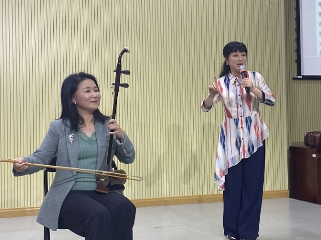 蔡霞的讲座以琴弦音乐作品赏析为主体,由表及里,从湖湘境美、湖湘韵美、湖湘艺美、湖湘梦美四个篇章阐述了音乐中的湖湘人文地理和文化精神。她分别介绍了扬琴、琵琶、中阮、古筝和二胡作品中的湖湘名家名作,展示了肖雅瑜等作曲家新时代的代表作品,并邀请青年古筝艺术家董蓓蓓上台现场演绎了一曲《洞庭新歌》,让在场师生从音乐中感受湖湘壮丽的山水风光。她重点介绍了大筒的历史渊源、发展现状、材质和音色以及大筒的名曲,并通过自己的学习体验,展示了大筒的文化传承和社会影响力。她还讲述了“梨园锦绣”“天山湘女”等作品的演艺故事和自己的艺术追梦故事,叙说了自己与李谷一、雷佳、王丽达等湘籍女歌唱家联袂合作表演的艺术情缘。她表示,作为湖湘文化的一张名片,大筒的艺术魅力还需要一代代人坚持不懈地去努力推广。