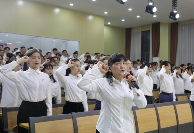 活动现场,122名大学生新党员身着白衬衫、佩戴党徽,合唱《我宣誓》。高亢有力的歌声回荡在报告厅中,回响在每名新党员的心里。合唱结束后,全体新党员面向党旗,举起右手,在领誓人王颖梅的带领下,庄严宣誓“为共产主义奋斗终身”。