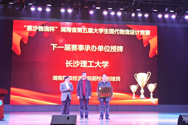 颁奖典礼上,与会领导和嘉宾为优秀组织奖获奖单位、一二三等奖获奖队伍和“最具行业价值奖”获奖队伍颁奖。此外,还举行了下一届赛事承办单位授牌仪式,刘建民将承办单位牌匾交还给主办方代表曾思亮,并由其交到下一届承办方长沙理工大学代表黄立宏的手中。