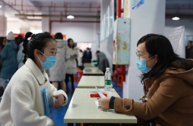 招聘会现场氛围热烈,疫情防控、后勤保障等工作安排到位,用人单位与毕业生不停地相互介绍自己,各自精心挑选“心动对象”。