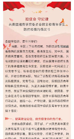 为坚决打赢疫情防控阻击战贡献湖南力量,湖南省高校突击队发出倡议,引导广大团员青年立即行动起来。