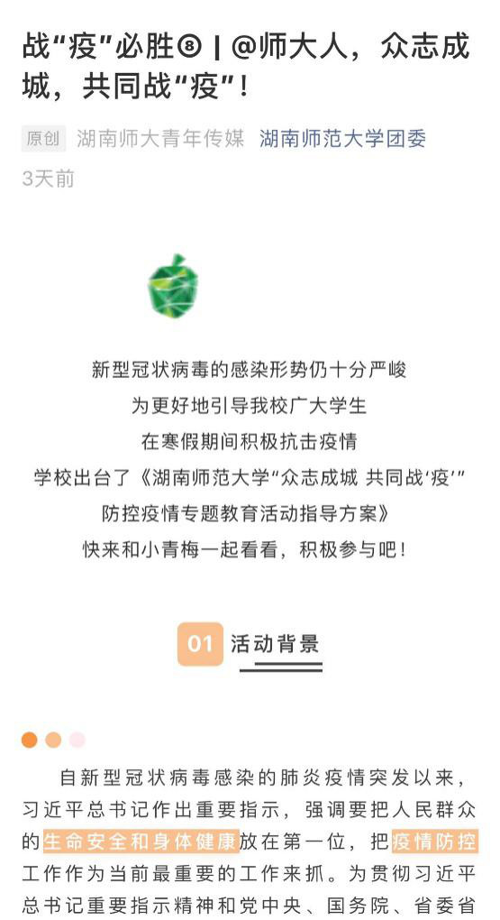 长沙理工大学突击队积极响应上级组织领导指示,及时下发推送通知《@长理学子:抗击疫情,我们这样做!》要求全校师生积极响应,落实履行。制作原创推送《见字如面,温暖在心,武汉加油,中国加油!》、《宅学两不误,杨梅告诉你|你已进入线上学习模式,请点击!》等指导学生在抗疫期间调整心态、做好学业规划,长理学子以不同形式为抗疫加油,做到“学习不间断、充实有作为”,立志为抗疫贡献长理力量。