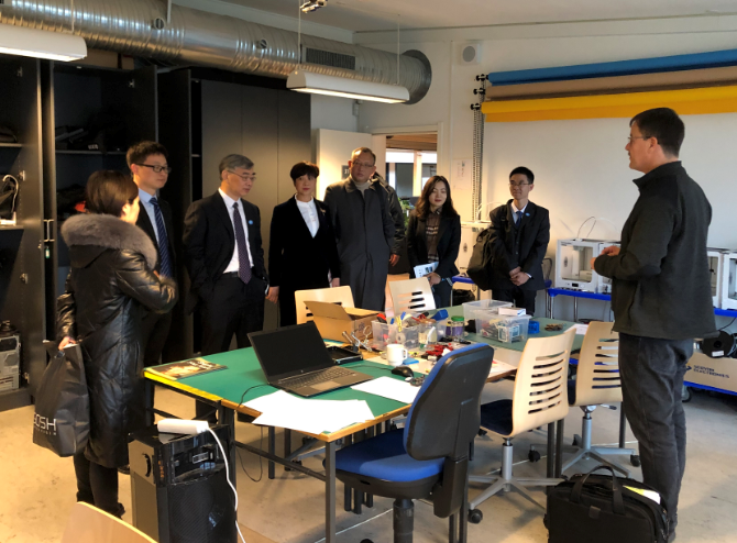 3日,湖南财院代表团访问考察了位于哥本哈根的丹麦西兰商业技术大学,受到该校奎尔校区校长以及教师代表的亲切接待。在该校负责国际交流事务的安妮·凯瑟琳女士引导下,代表团参观了学校各区间。西兰商业技术大学由五所上百年历史的独立的商学院合并而成,是丹麦第五大高等教育学府。其国际营销与市场管理、物流管理、计算机科学与应用、电子商务开发、交互式多媒体与设计等专业特色鲜明。交流中,代表团了解到,该校的行政办公区与教学和学生活动区无缝融合,以方便管理者、教师和学生之间自由沟通。教学上强调讨论、反馈、理论和实践相结合的教育方法和研究方法,多形式为学生们提供学术、学科交叉和工作室的个性化安排。代表团还走进多媒体与设计课堂,现场聆听了该校教师讲解关于数据采集、模型设计和3D打印等主题内容的教学方案。最后,双方就师资科研项目合作及师生交流培训项目进行了深入洽谈。