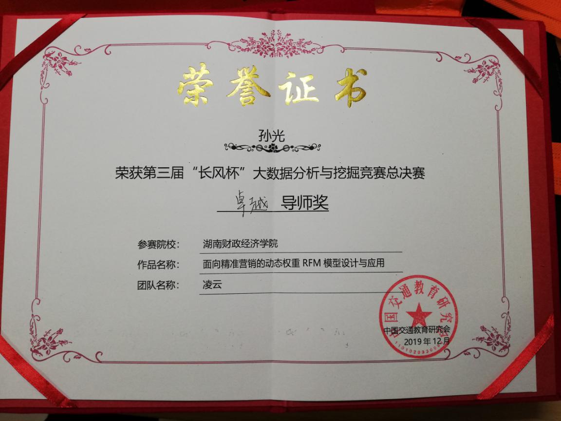 湖南日报·新湖南客户端12月19日讯(通讯员 孙光)12月8日,第三届“长风杯”大数据分析与挖掘竞赛全国总决赛在湖南工商大学举行。经过激烈角逐,由湖南财院信息技术与管理学院孙光老师指导的电子商务专业专业学生周双、魏宗科、周媛李湘林组成的学生团队获大赛一等奖,孙光老师获得卓越导师奖。