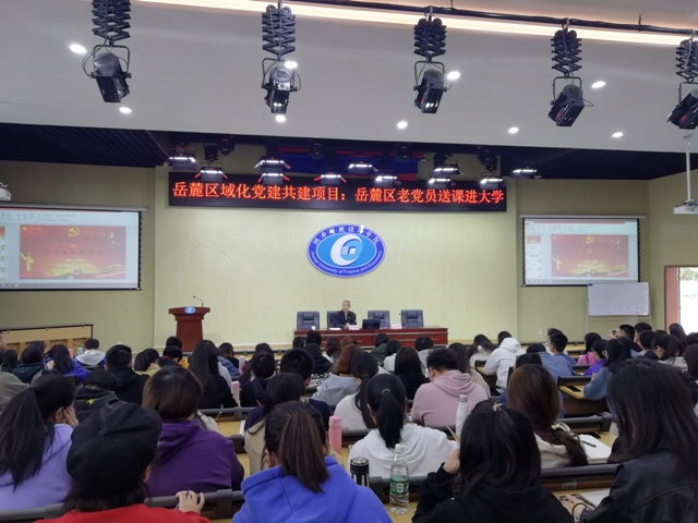湖南日报·新湖南客户端11月28日讯(通讯员 姚旭辉)11月20日下午,2019年岳麓区域化党建共建项目“岳麓区老党员送课进大学”在湖南财院二教学楼阶梯三教室举行。长沙市“五老”金牌讲师团成员,中国老教授协会会员,上海国防战略研究所研究员、教授,湖南国际教育科学研究院专职顾问吴传桂为湖南财院党员发展对象讲授“党的初心使命与当代青年的担当”党性教育专题党课。湖南财院党委委员、组织部部长兼党校常务副校长王颖梅、机关党总支书记姚旭辉,岳麓区委组织部、老干部局工作人员等参加专题党课。党课由姚旭辉主持。