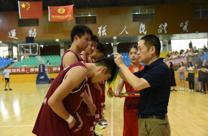 湖南财院党委书记肖湘愚为男子组第一名获奖代表队颁奖