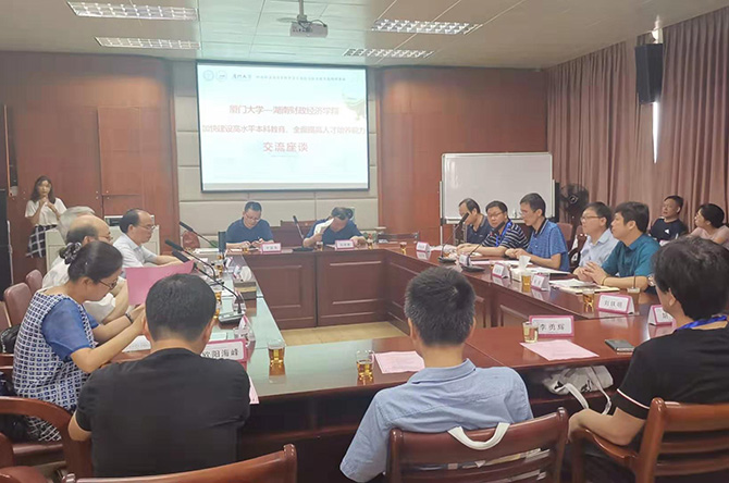 7月31日,湖南财院研修人员与厦门大学相关职能部门及二级学院主要负责人开展了主题为“加快建设高水平本科教育 全面提高人才培养能力”的座谈交流,主要就本科教育与人才培养两个方面进行深入探讨。座谈会上,刘建民介绍了湖南财院本科教育的有关情况和人才培养的主要做法,并就学科建设、专业建设、教学等方面提出了交流的问题;学生工作部部长杨锴、经济学院院长刘辉煌、公共管理学院院长宁国良等就部门或学院有关工作提出了交流问题。厦门大学研究生院常务副院长方颖、公共事务学院院长朱仁显、经济学院副院长朱孟楠、能源学院副院长王兆林、教务处副处长黄艳萍等相关部门或学院负责人就湖南财院研修人员提出的问题作了解答,详细介绍了厦门大学的经验与做法。
