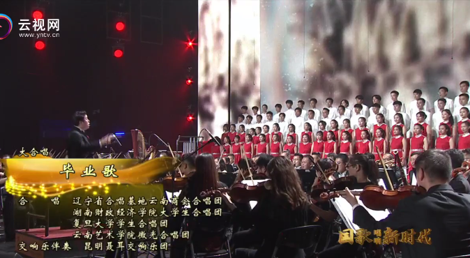 17日晚,在云南省大剧院,湖南财院大学生合唱团与辽宁、云南、上海等四地合唱团在开幕式上联袂演唱《毕业歌》