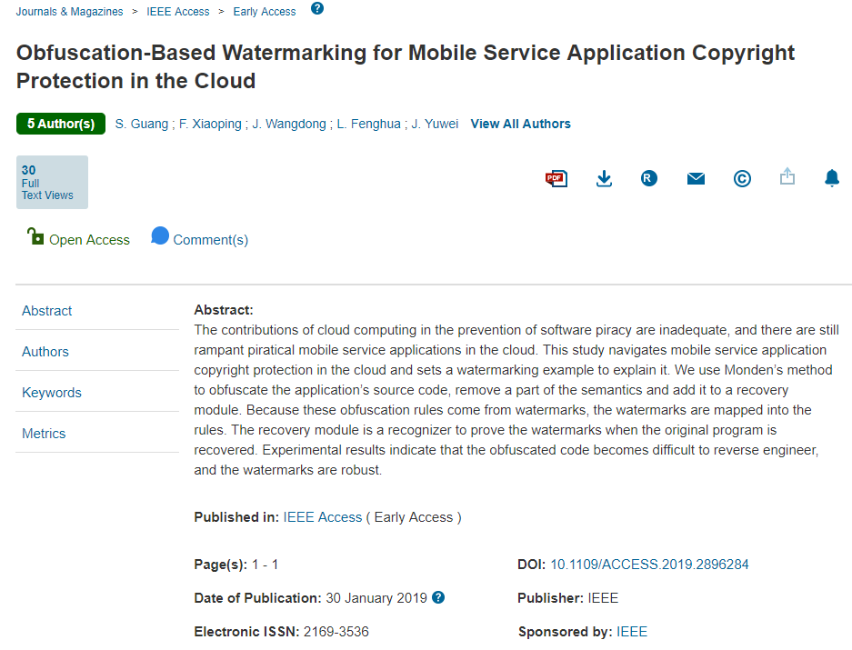以湖南财院樊晓平教授、孙光博士为通信作者、第一作者的两篇学术论文“Obfuscation-based Watermarking for Mobile Service Application Copyright Protection in the Cloud” (基于混淆水印的云上通讯软件产权保护方法研究,doi:10.1109/ACCESS.2019.2896284)“An Oil Painters Recognition Mobile Method Based on Cluster Multiple Kernel Learning Algorithm” (基于聚类多核学习算法的油画识别移动方法研究,doi:10.1109/ACCESS.2019.2899389)分别被SCI一区期刊《IEEE Access》网络发表(见图2),“Expanding Hot Code Path for Data Cleaning on Software Graph”(基于热代码扩充的软件图数据清洗,第一作者孙光)被《Computers, Materials & Continua》录用,“A Scalable Approach for Fraud Detection in Online E-Commerce Transactions with Big Data Analytics”(基于大数据分析的在线电子商务交易欺诈检测的可扩展方法,第一作者周航军)被Computers, Materials & Continua录用,“Improved Arabic-Chinese Machine Translation with Linguistic Input Features”改进的阿拉伯语 - 汉语机器翻译与语言输入功能,通信作者樊晓平)被《Future Internet》录用。在团队教师指导下,信息技术与管理学院2015级本科生吕鸿章为第一作者的“General Process of Big Data's Analysis and Visualization”(大数据分析与可视化的一般过程)被《International Journal of Computational Science and Engineering》录用,2015级本科生李丰华为第一作者的“Brief talk about big data graph analysis and visualization”(简要介绍大数据图分析和可视化)被《Journal on Big Data》录用。