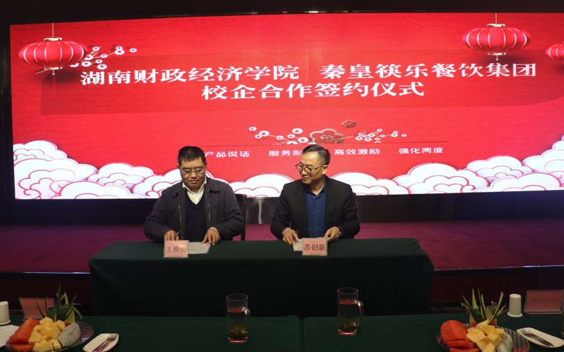 新湖南客户端2月20日讯(通讯员 李民栋)1月15日上午,湖南财院与秦皇筷乐餐饮集团校企合作签约仪式暨就业创业实习基地授牌仪式在秦皇筷乐餐饮集团会务大厅举行。湖南财院副校长王焕清、招生与就业创业指导处处长蒋勇威,秦皇筷乐餐饮集团董事苏创新、人力资源总监刘新智慧,创新创业办公室副主任李民栋以及筷乐潇湘等企业代表出席签约仪式。