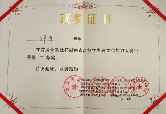 整个大赛贯穿在实施“一带一路”战略中要提升中华文化的国际影响力,塑造中国形象、讲好中国故事、传播中国声音的宗旨。参与此次大赛不仅又一次深化了湖南财院师生对新时代大学生应具备的国际视野和跨文化综合能力的认识和理解,也必定促进学校外语教学的发展和新时代外语人才培养模式的探索。