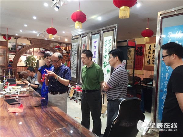 随后,肖湘愚一行来到雨花非遗馆,在雨花区宣传部副部长别必雄、非遗馆馆长邓运姣、郭存勇的带领下,参观了非遗馆的各展厅和创意工作坊,欣赏了非遗传承人的技艺,了解了非遗活态传承与互动研学旅游的融合情况。