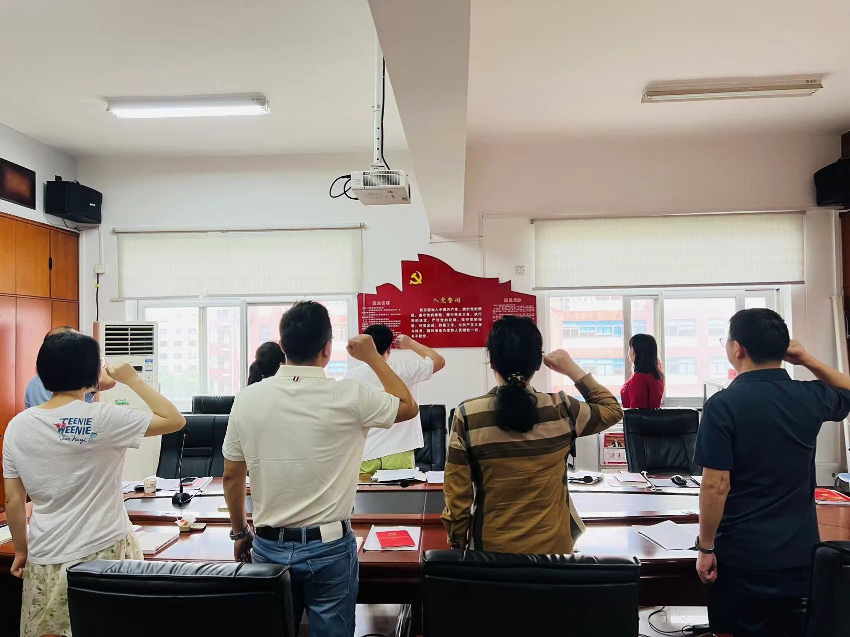 “我志愿加入中国共产党,拥护党的纲领,遵守党的章程……”全体党员佩戴党徽,高举右拳,面对鲜红的党旗,在领誓人的带领下,齐声重温入党誓词。誓言铿锵有力,提醒着每一位党员不忘初心使命,坚定理想信念,为党的事业不懈奋斗。