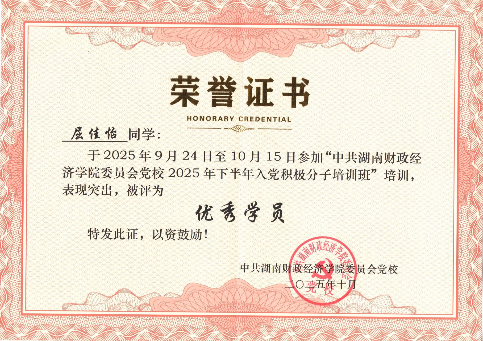 (本网讯)10月15日下午,学校联合分党校2025年下半年入党积极分子培训班结业典礼在主校区第二教学楼2217教室举行。机关第十一党支部入党积极分子屈佳怡在联合分党校培训班中表现突出,态度认真、积极学习,获得了“优秀学员”荣誉称号。