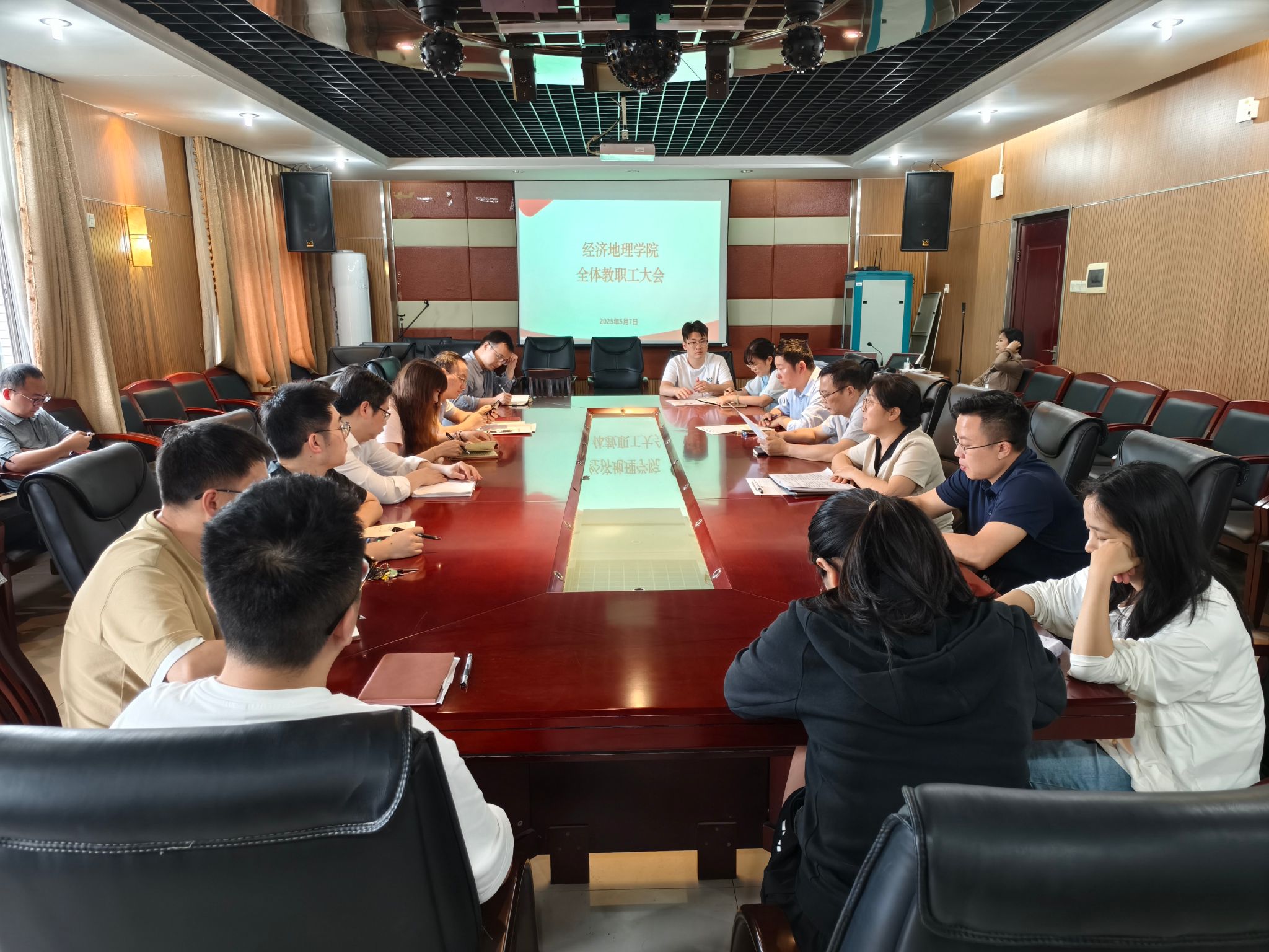 (本网讯)5月7日下午,经济地理学院在主校区办公楼1014会议室召开全体教职工大会。会议由副院长苏昌贵主持,院长彭文斌、院直属党支部书记姚旭辉出席会议、全体教职工参加会议。