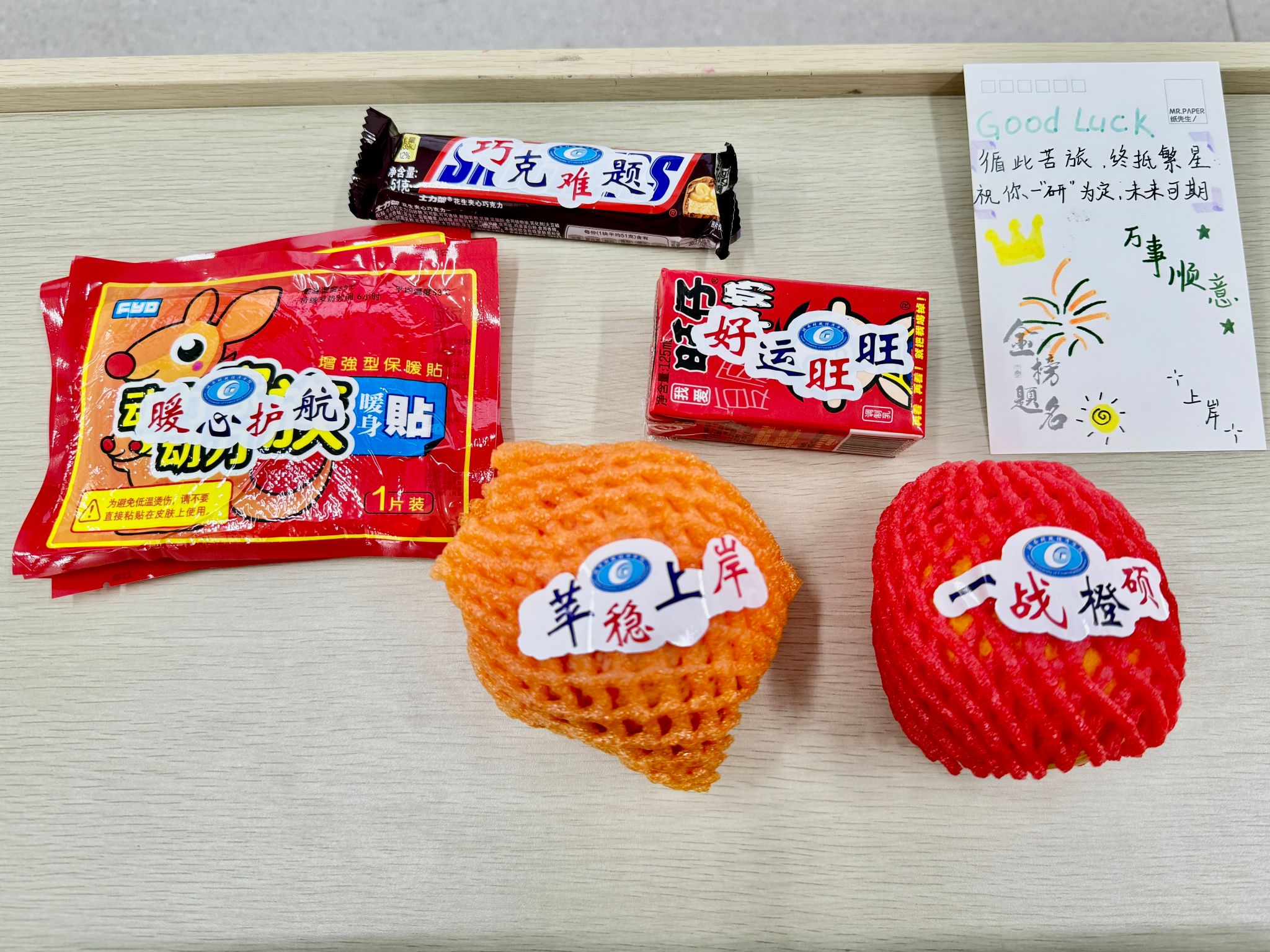 学院心系逐梦研途的学子,特意定制满载关怀与期许的“考研加油包”,为冲刺备考注入温暖力量:旺仔牛奶添“旺”力,助学子劲头十足;暖宝宝驱散寒意,护学子安心备考;苹果寓意“平安上岸”,橙子承载“心想事‘橙’”,士力架补充能量,再搭配饱含师长殷切祝福的定制明信片。每一份精心挑选的礼品,都凝结着学院对学子的深情牵挂,为日夜苦读的备考之路保驾护航。