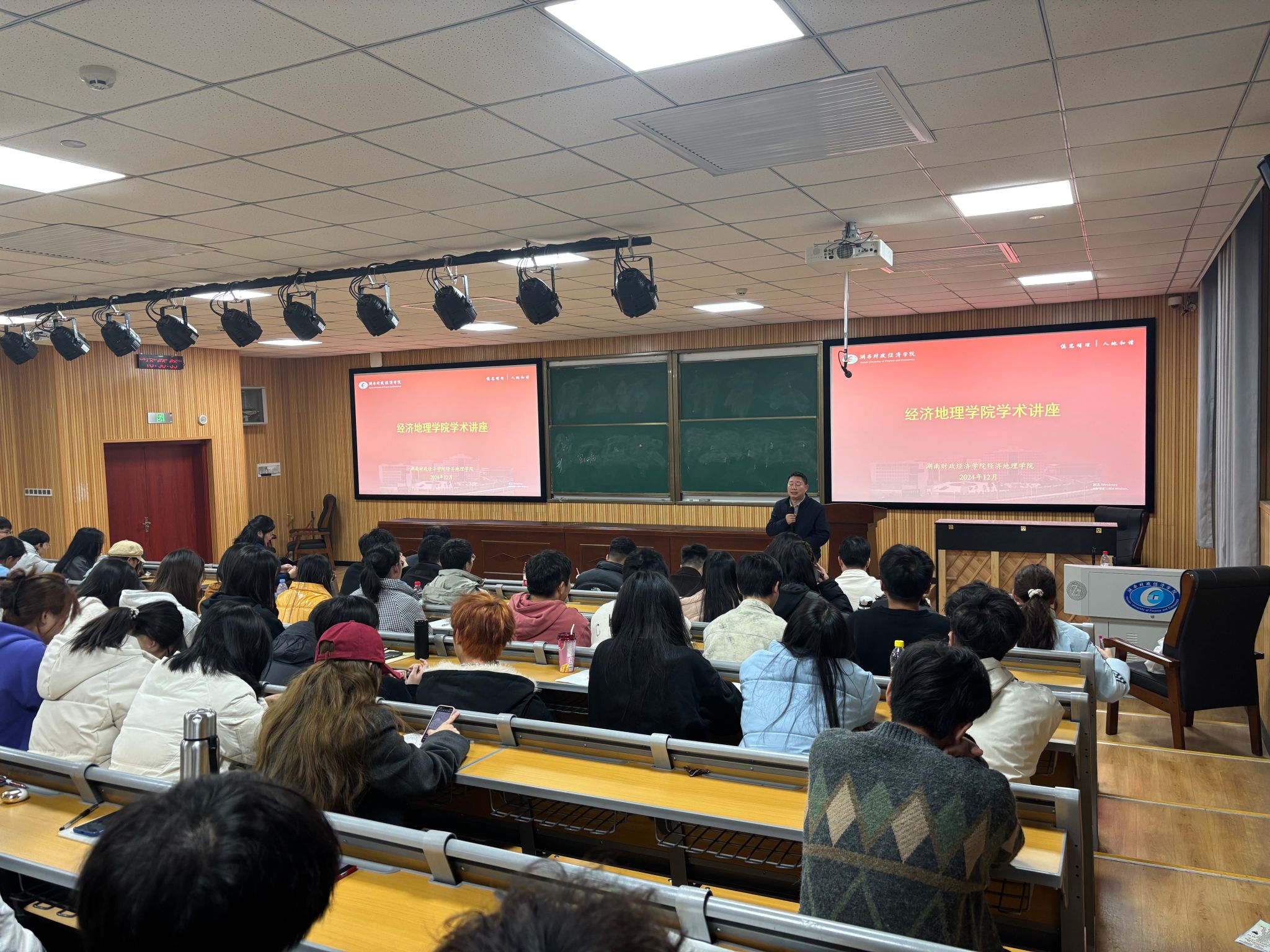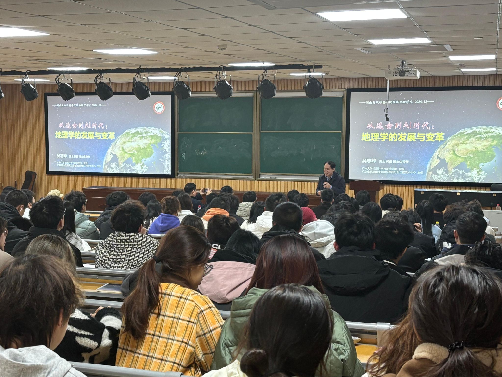 (本网讯)12月4日下午,经济地理学院邀请广州大学地理科学与遥感学院院长吴志峰教授、湖南文理学院地理科学与旅游学院院长傅丽华教授作专业认知讲座,活动由学院副院长苏昌贵主持,学院学科办、教务办、两系主任、辅导员以及全体2024级新生200余人聆听了讲座。