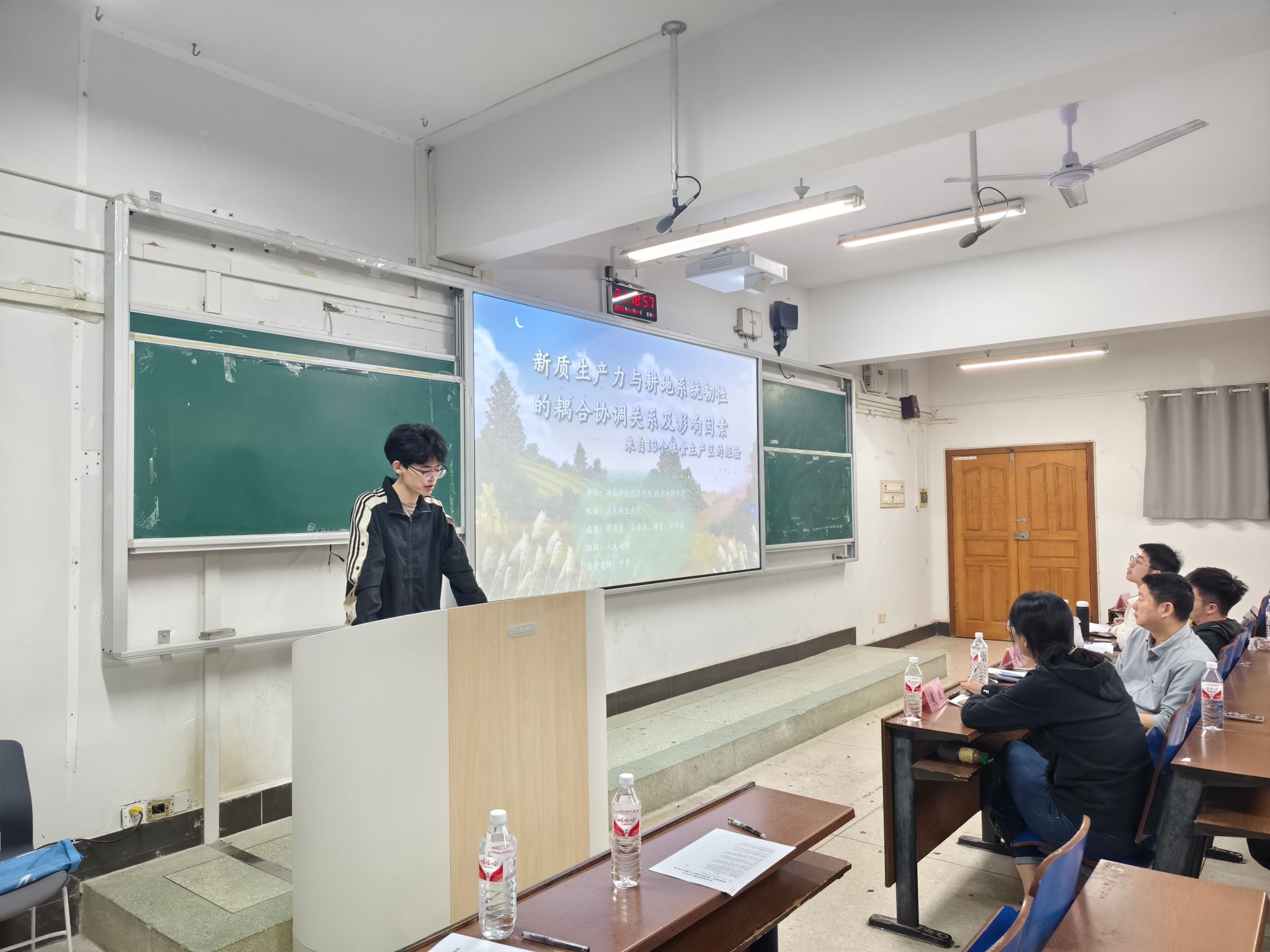本次选拔赛由经济地理学院团学会科创部组织,邀请了我院领导和老师担任评委。经过前期自主报名,共有5支队伍参加本次选拔赛,其中自然地理方向各组围绕生态韧性、气候变化等前沿议题,人文地理方向各组围绕新质生产力与耕地系统韧性、气候变化对城市人居环境的影响、洞庭湖地区血吸虫疫情潜在风险演化等热点问题展开研究。