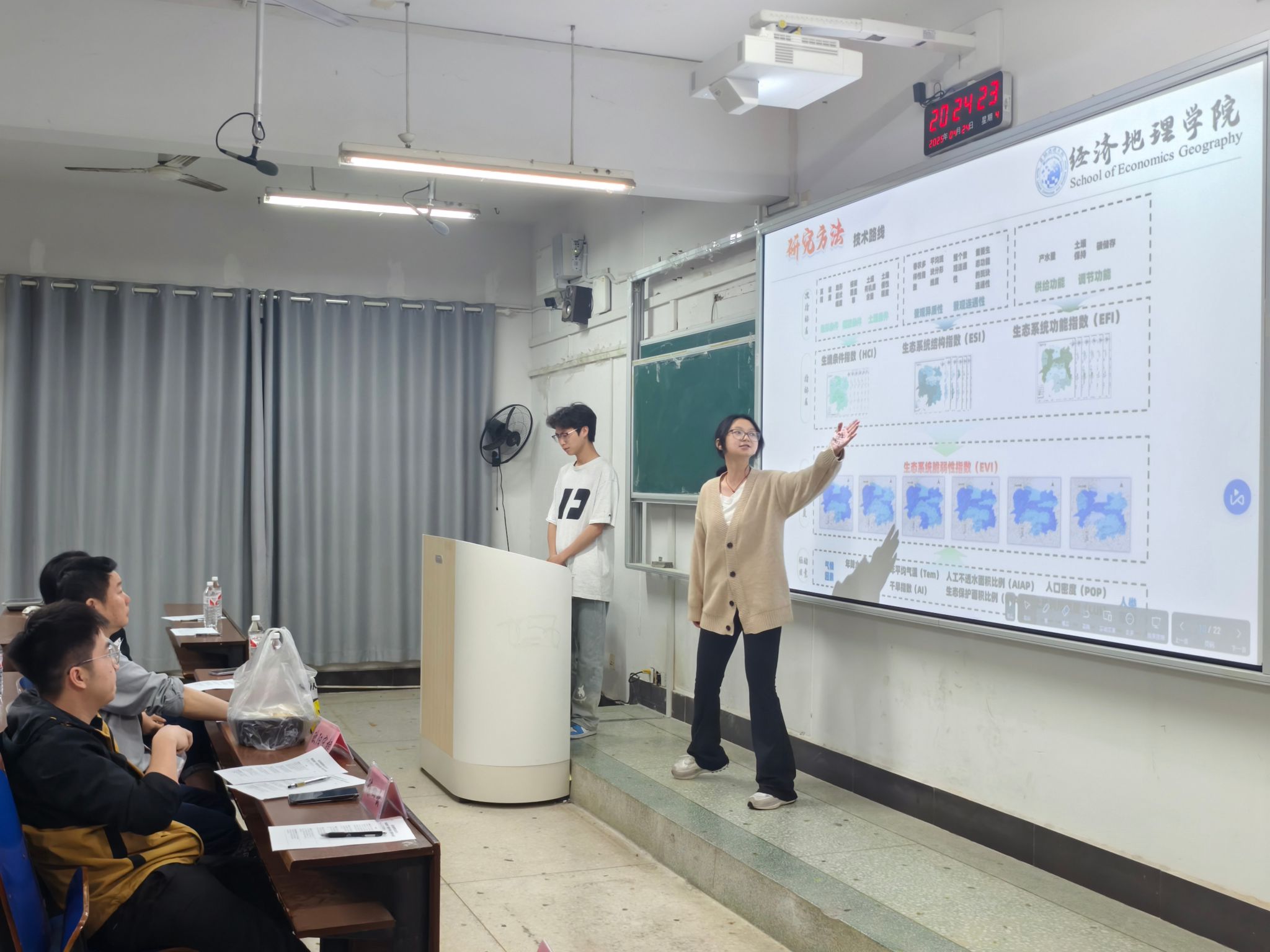 赛事采用“8分钟汇报+3分钟答辩”的赛制,评委老师从选题创新性、理论深度、方法科学性、实践价值及展示效果五个维度进行综合评分。参赛团队通过遥感影像分析、偏相关分析法、因果分析法等多元技术手段,充分展现地理学科特色,综合归纳空间规律性,系统解析机制复杂性,为推进人与自然和谐共生的现代化贡献力量。答辩环节中,评委们针对研究设计的逻辑闭环、数据处理的严谨性、技术方法可行性等提出专业建议,现场学术氛围浓厚。