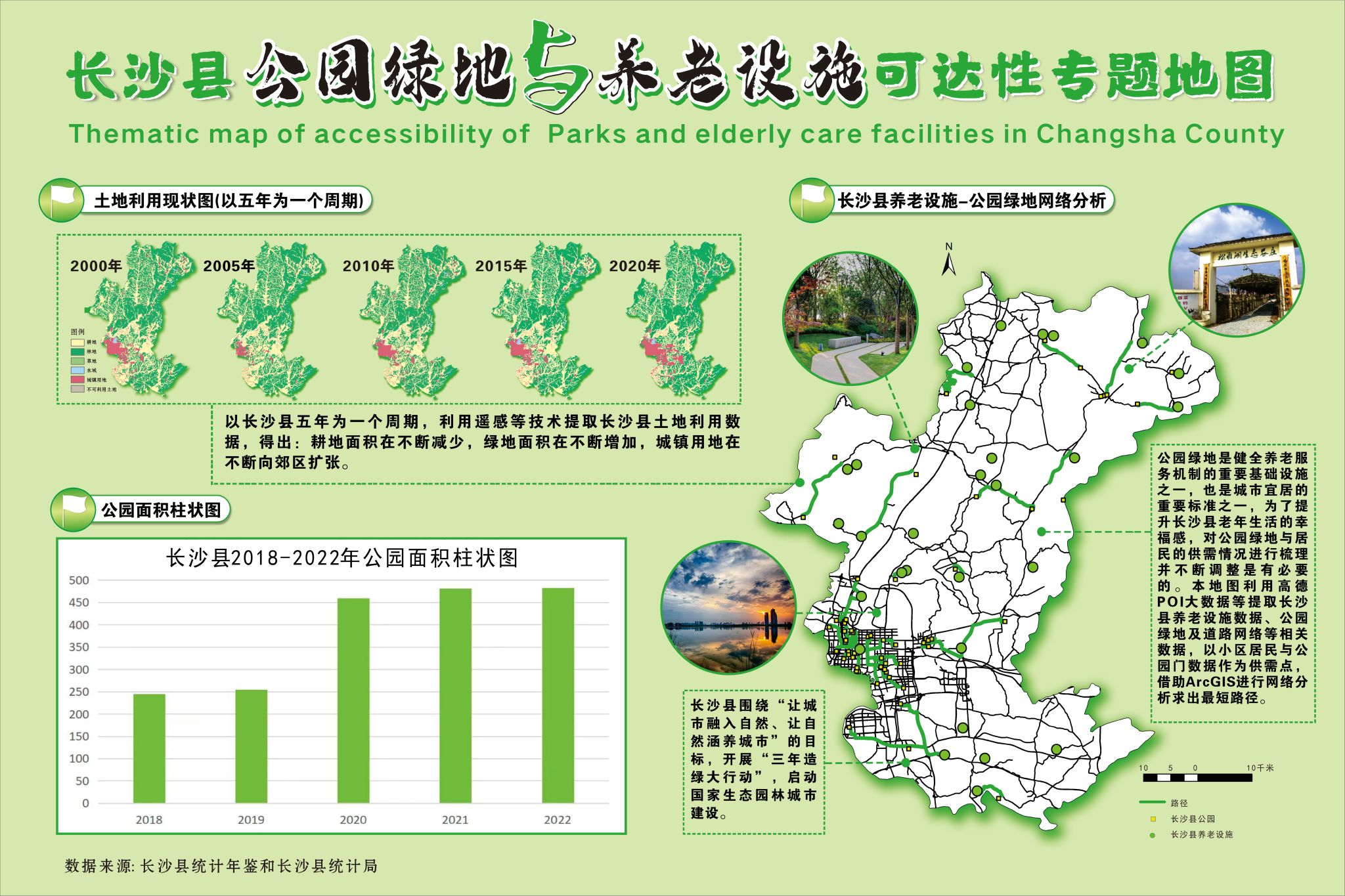 在众多参赛作品中,获奖作品紧扣“湖南故事”这一主题展开创作,例如《星沙医脉·颐养经纬——基于设施可达性分析的浏水康养空间叙事》,巧妙运用GIS技术对养老设施布局进行了深入分析,使作品既具备严谨的科学性,又蕴含着浓厚的文化韵味;《长沙县公交站点与养老设施可达性专题地图》则聚焦城市公共服务领域,巧妙地将数据整合与可视化设计相结合。此外,《潇湘生态旅游图》《湖南省地形分析》等作品也以独特视角呈现湖南自然与人文特色。