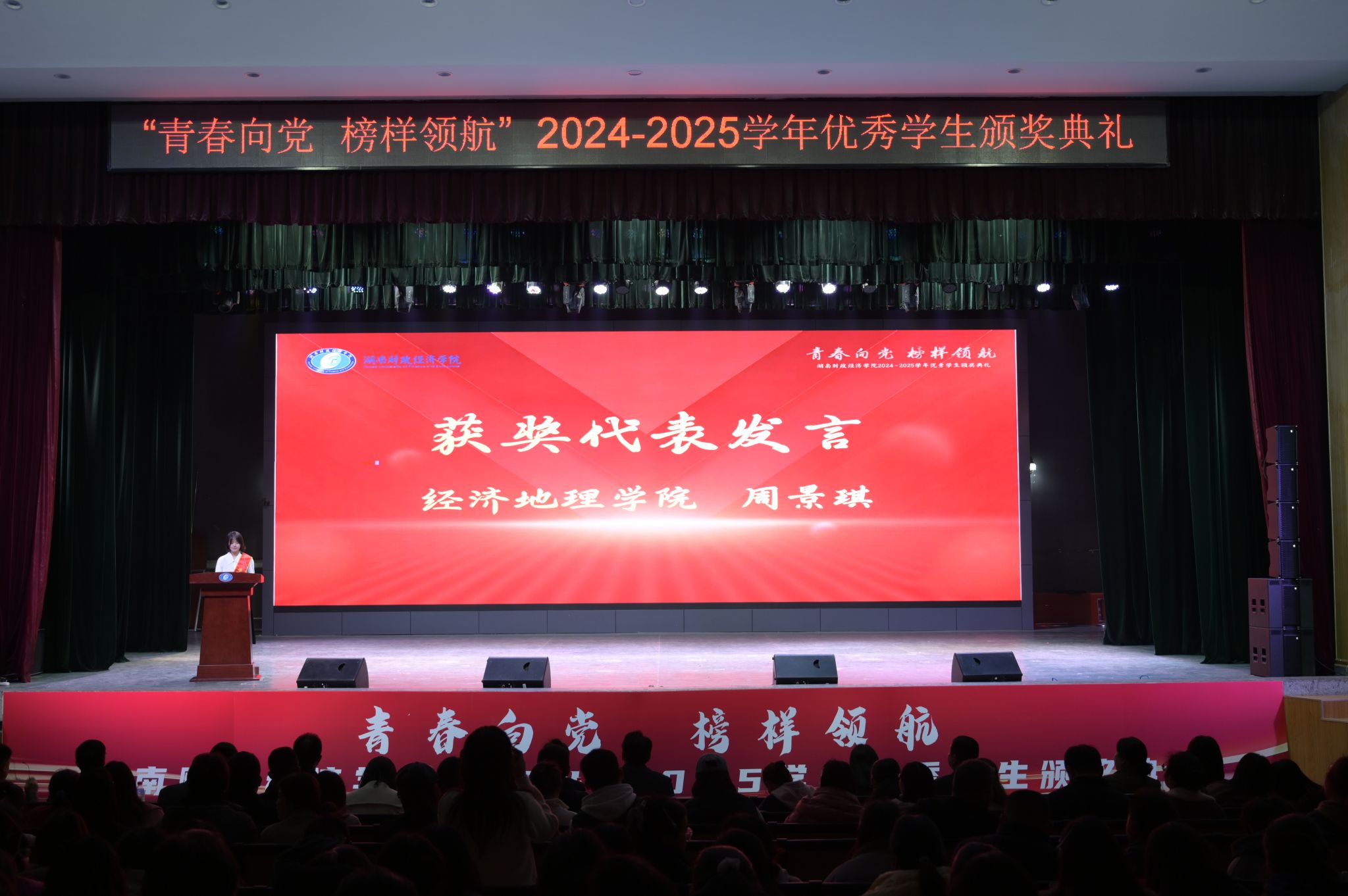 (本网讯)12月18日晚,学校在大礼堂隆重举行了“青春向党 榜样领航”2024-2025学年优秀学生颁奖典礼。本次典礼由学生工作部、武装部承办,学院2023级人文地理与城乡规划三班凭借优异的综合表现获评2024-2025学年先进班级标兵,并作为典型班级代表发言,全面分享了班级的建设成果,充分展现了新时代大学生全面发展的良好风貌,赢得现场师生的阵阵掌声。