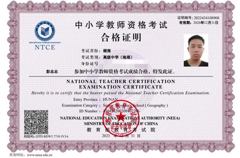 高中地理教师资格证考试彭志志利用一个暑假,每天花两三个小时专心背资料,最终顺利拿下。这一路的考证经历有汗水也有收获,英语六级的多次挑战让彭志志懂得坚持与方法的重要性,而教师资格证的备考则让体会到专注与积累的力量