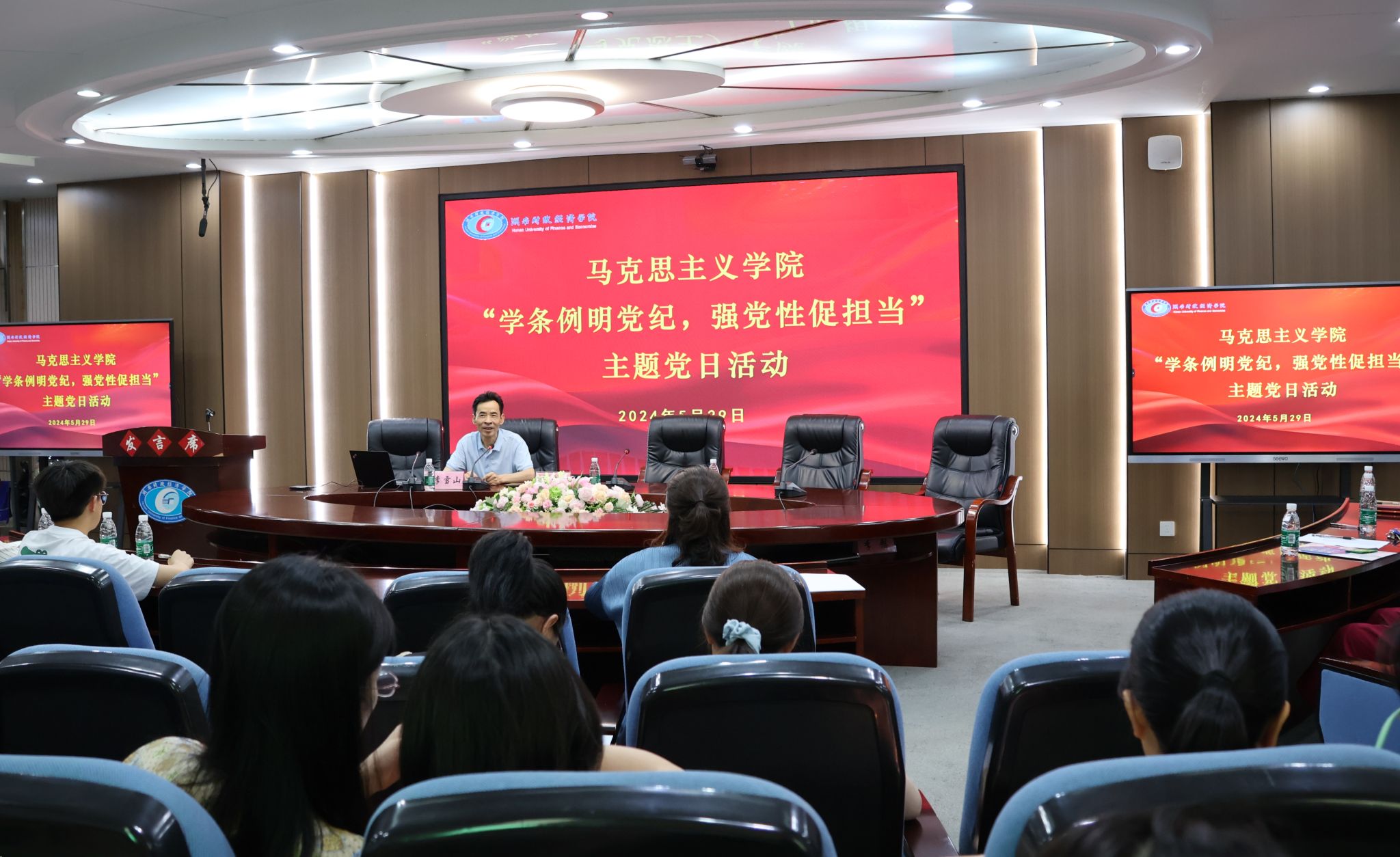 5月29日下午,校纪委书记李雪山在办公楼五楼视频会议室为马克思主义学院全体党员讲授“党纪学习教育”专题党课。活动由院直属党支部组织委员周奕主持。