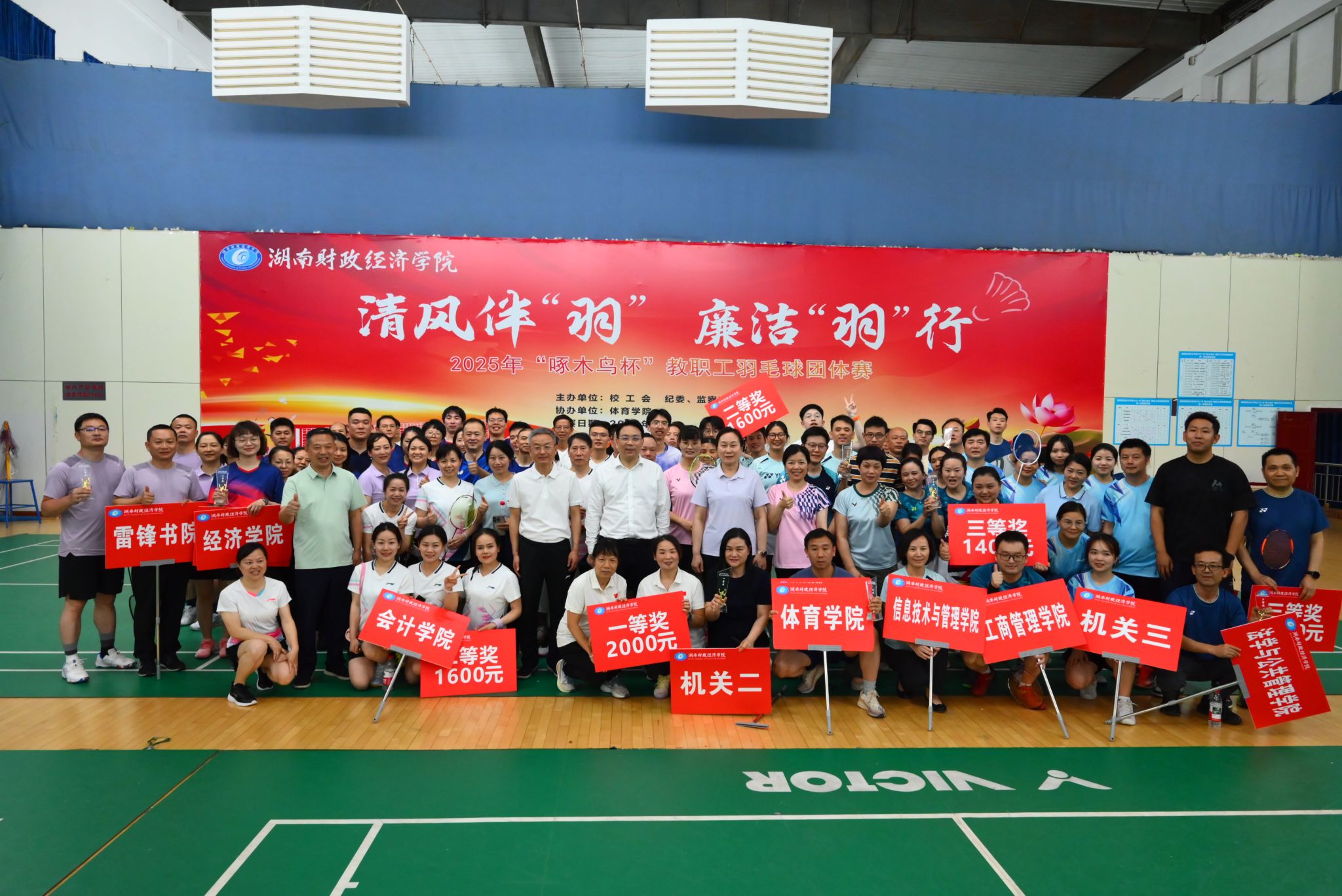 (本网讯)5月7日至12日,由校工会、纪委联合主办的2025年“啄木鸟杯”教职工羽毛球团体赛在主校区体育馆举行。校党委书记易棉阳,党委副书记苏玲,副校长赵鹤平,纪委书记李雪山,副校长、校工会主席刘钟理出席开幕式。来自18个分工会的300余名教职工以球会友,在挥拍扣杀间传递活力,在知识竞答中弘扬廉洁风尚。