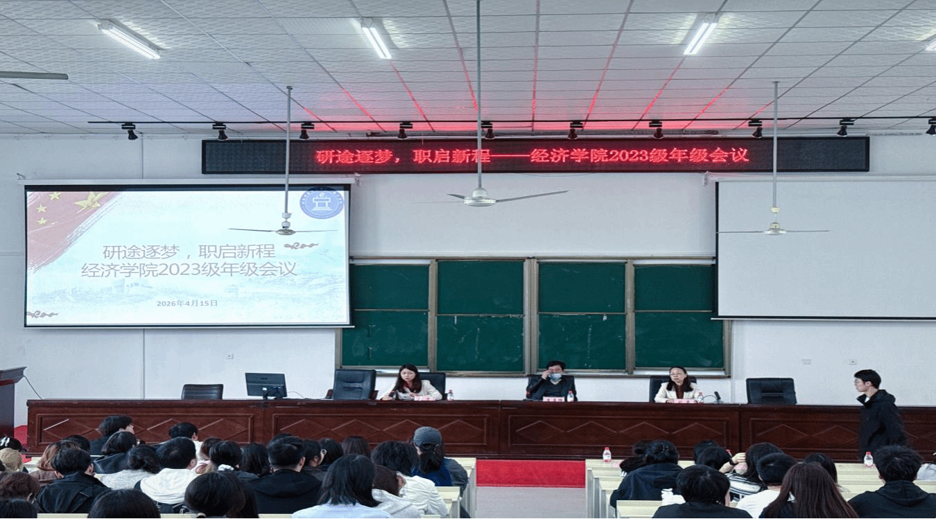(本网讯)为进一步明确2023级学生发展方向,统筹推进考研备考与就业指导工作,引导学子科学规划学业与职业路径,4月15日下午,经济学院“研途逐梦,职启新程”2023级年级大会在2J01阶梯室顺利召开。全体学院领导,2023级辅导员及全体学生参会。会议由副院长陈雯主持。
