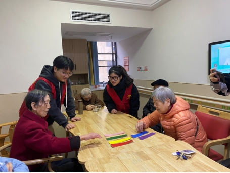 同时,志愿者们还准备了简单易学的小游戏——抢彩条。大家用心地和老人们讲解游戏规则和玩法,老人们清楚游戏规则后,很快地融入其中。会书法的老人还为志愿者展示了书法,有趣的互动为老人们的生活增添一份乐趣。