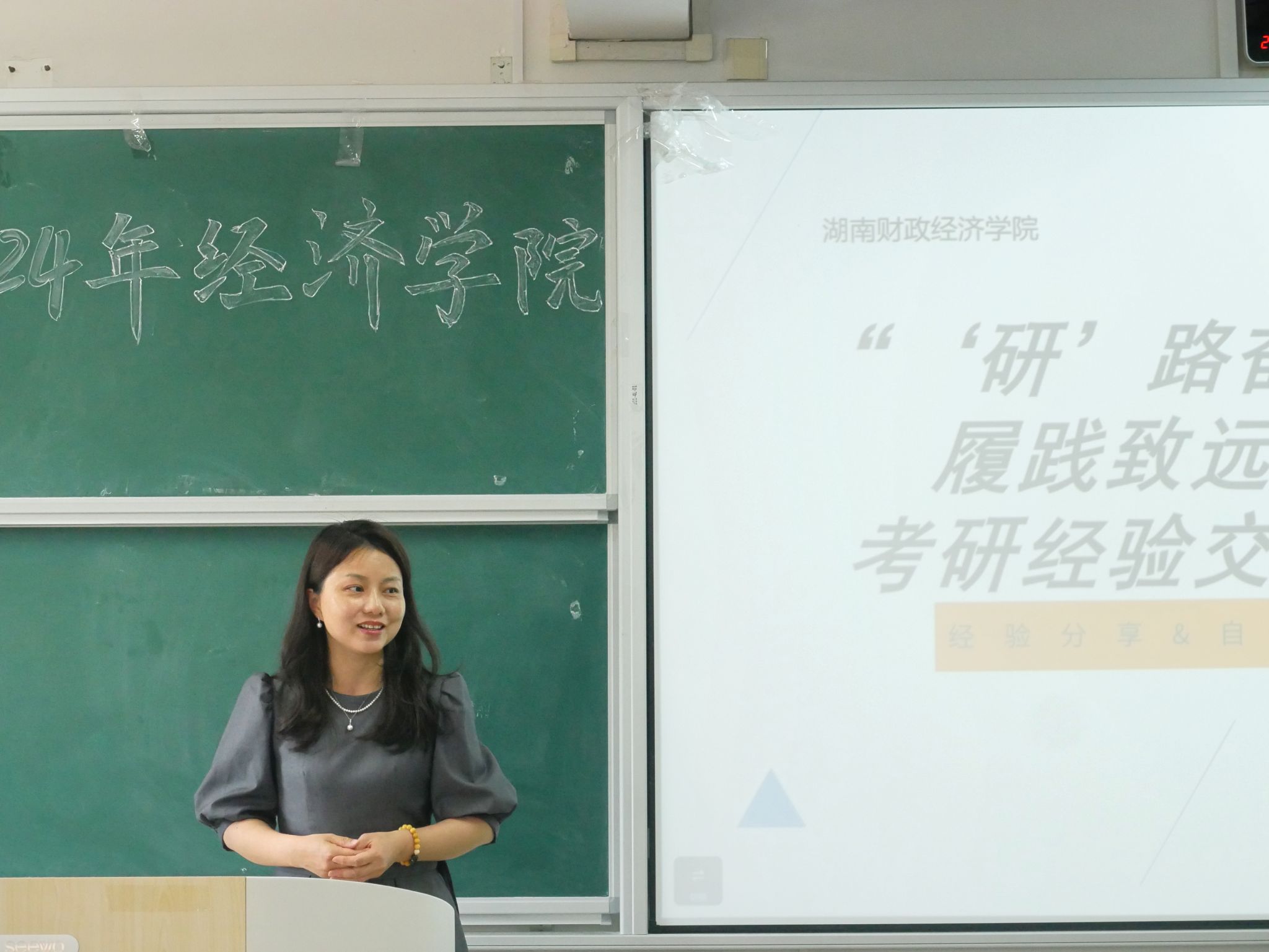 (本网讯)为激发学生的考研热情,增强学生考研的信心和决心,创造良好的学习氛围,推动我院的学风建设。经济学院于5月15日15:00在三教3110教室成功举办了“‘研’路奋勉,履践致远”考研经验分享会。本次经验分享会特邀我院2020级优秀的考研学生代表分享考研经验,经济学院党委副书记刘英、副院长陈雯、学工负责人谢龙、全体辅导员以及21、22级有考研意向的同学出席本次会议。