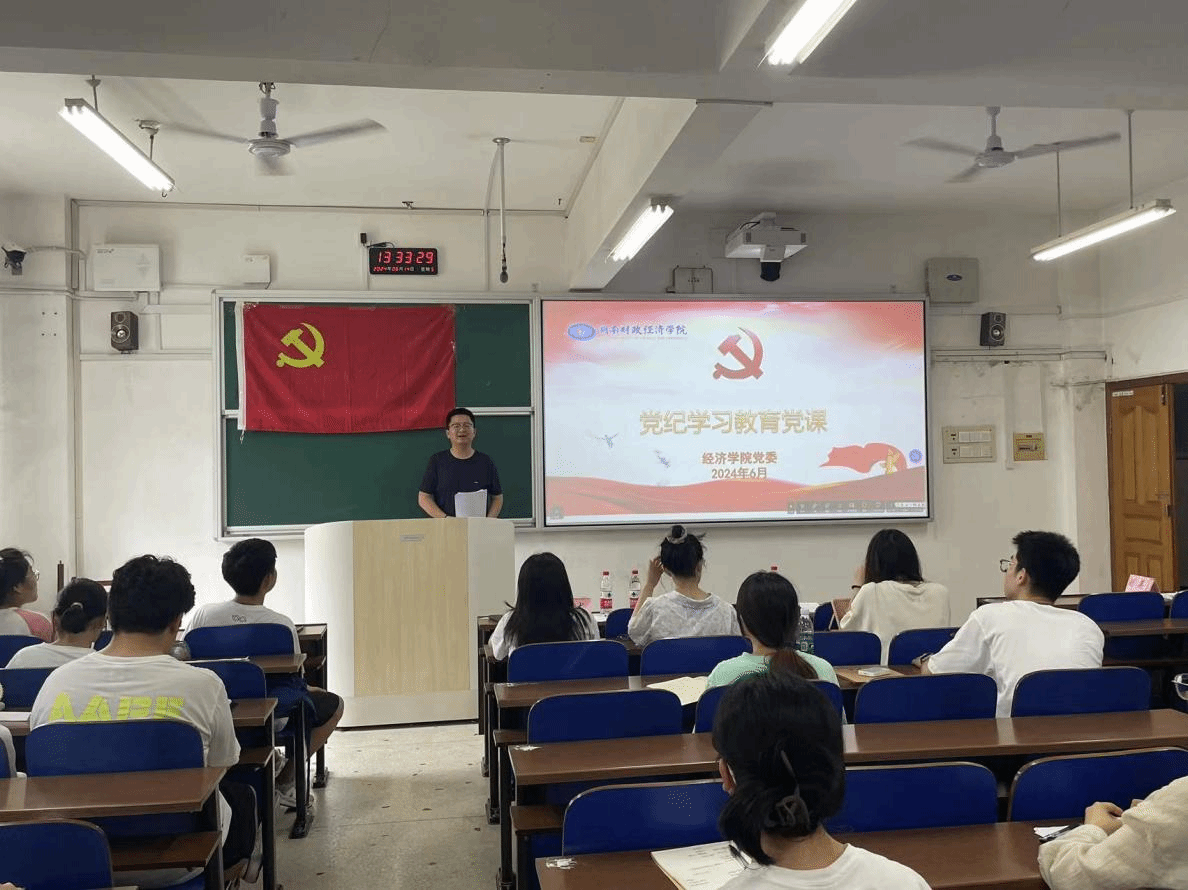 (本网讯)2024年6月14日下午,经济学院学生第一党支部在主校区3313教室开展了党纪学习教育专题党课。党课由学生第一党支部书记谢龙讲授。