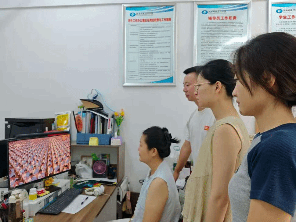 上午9时许,阅兵仪式正式拉开帷幕。师生们或齐聚会议室,或在宿舍、家中肃立屏前,伴随激昂旋律齐声高唱国歌,爱国情怀在歌声中凝聚。在重要讲话环节,大家凝神倾听,深刻感悟历史启示与时代号召;当受阅官兵迈着铿锵有力的步伐依次通过天安门广场,整齐的队列、昂扬的斗志赢得师生阵阵掌声;新型主战装备列阵亮相,四支战略兵种首次集中登场,更是让现场与屏幕前的师生惊叹不已,强烈的民族自豪感油然而生。