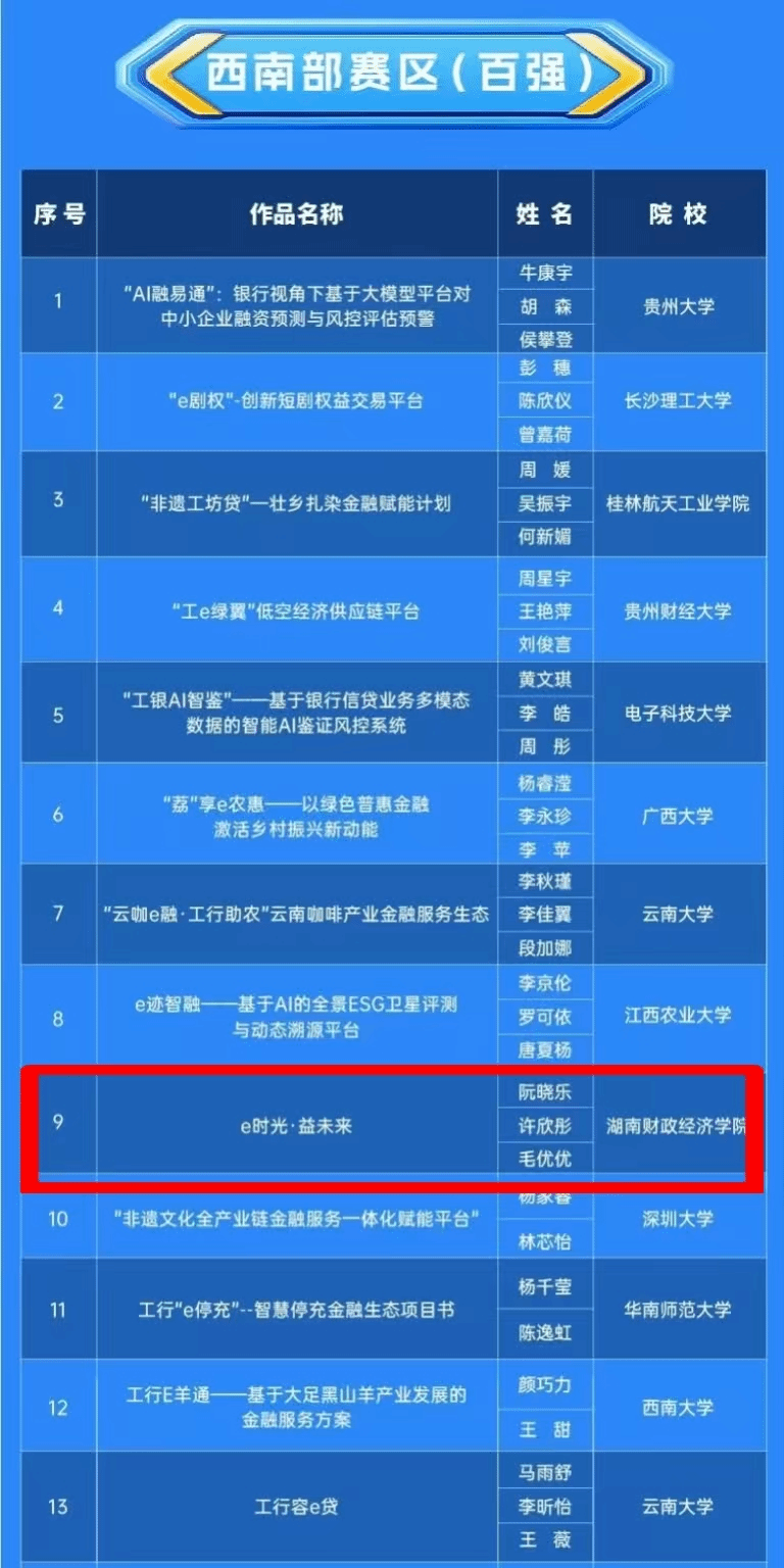 杨俊和胡小梅老师指导,阮晓乐、许欣彤和毛优优团队作品《e时光·益未来》结合区块链、智能合约技术,聚焦银发经济与可持续发展,以创新的解决方案获湖南赛区特等奖和西南部赛区百强,这是best365官网在工行杯金融创新大赛中取得的新突破。由李博达和李艳丰老师指导,陈泊涵、谢灵曦和李畅团队作品《情绪e站》关注Z世代消费行为,探索金融赋能情绪资产,荣获省级一等奖。《随e智服》、《e数达》《乡野e趣》等项目覆盖脑机支付、数据征信、乡村振兴等多个热点研究领域,分别荣获省级二等奖和三等奖,彰显学生对行业痛点的深刻洞察和积极探索。