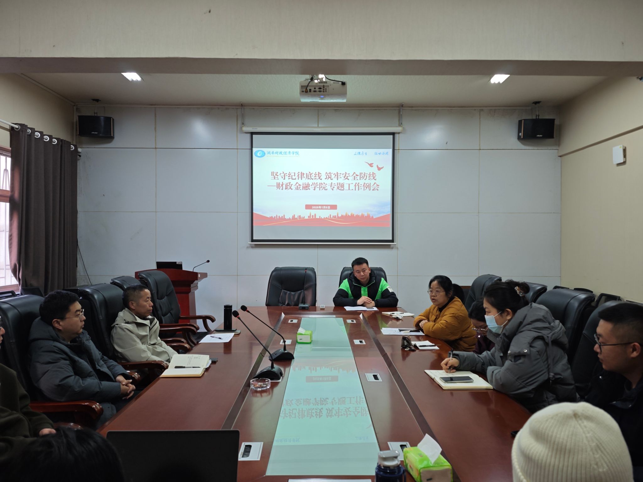 为进一步加强学生教育管理服务工作,筑牢校园安全稳定防线,1月6日下午15点,财政金融学院在行政楼119会议室召开学生安全工作专题例会,围绕学生假期安全教育、诚信参考、宿舍管理、学风建设等工作进行部署。学院党委书记肖燕飞出席会议并讲话,全院辅导员、班主任参加会议。会议指出,临近期末及寒假,学生教育管理工作进入关键阶段。全体辅导员、班主任要切实提高站位,压实责任,以“时时放心不下”的责任感抓好各项学生工作。要持续加强学生假期安全教育,...