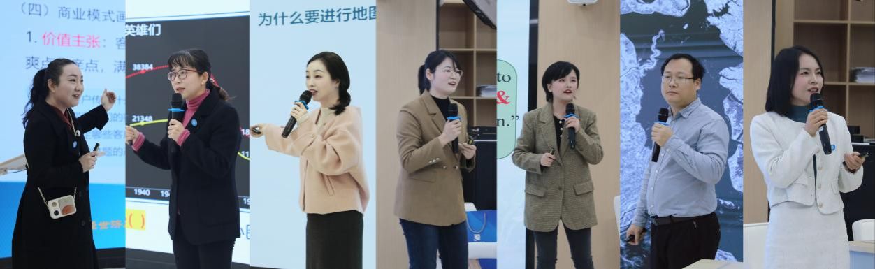 本次展示活动聚焦理工文组青年教师,7位来自不同学院的青年博士依次登台展示精彩教学片段。周雪老师以“商业模式设计”为主题,通过鲜活案例,解析商业模式画布的九大核心要素,将抽象的商业逻辑转化为可操作的实践工具;周筠老师围绕“D3扇形图的绘制与优化”,从折线图知识点回顾切入,结合案例展现了数据可视化教学的逻辑性与实用性;夏栗老师的“地图投影”课程,通过世界地图对比、投影变形实验等方式,生动阐释了“地图投影”的原理与应用场景;邱高老师以“商务英语阅读”为载体,运用三层分析模型拆解“绿色商业”文本,引导学生挖掘语言背后的意识形态与修辞策略;朱依霞老师带来“莫比乌斯环的拓扑奥秘”,通过动手实验、动画演示等互动形式,让抽象的数学概念变得直观易懂;陈超老师聚焦“水文与水资源学”中的径流环节,结合现实案例,解析径流形成过程与定量指标;谢佩君老师则从财务视角出发,妙用“底子”、“面子”、“日子”将三大财务报表化繁为简,传授财务报表分析的核心逻辑与投资决策思维。