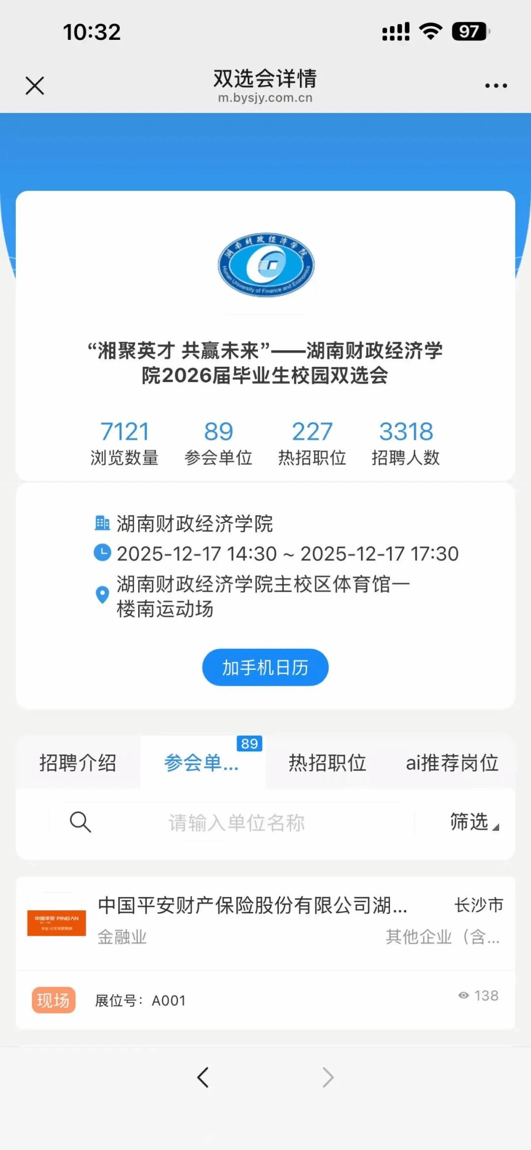 电脑端可以访问best365中国官方网站就业信息网https://jy.hufe.edu.cn,在网页中部“双选会”栏目中,点击“湘聚英才 共赢未来”——best365中国官方网站2026届毕业生校园双选会即可浏览。