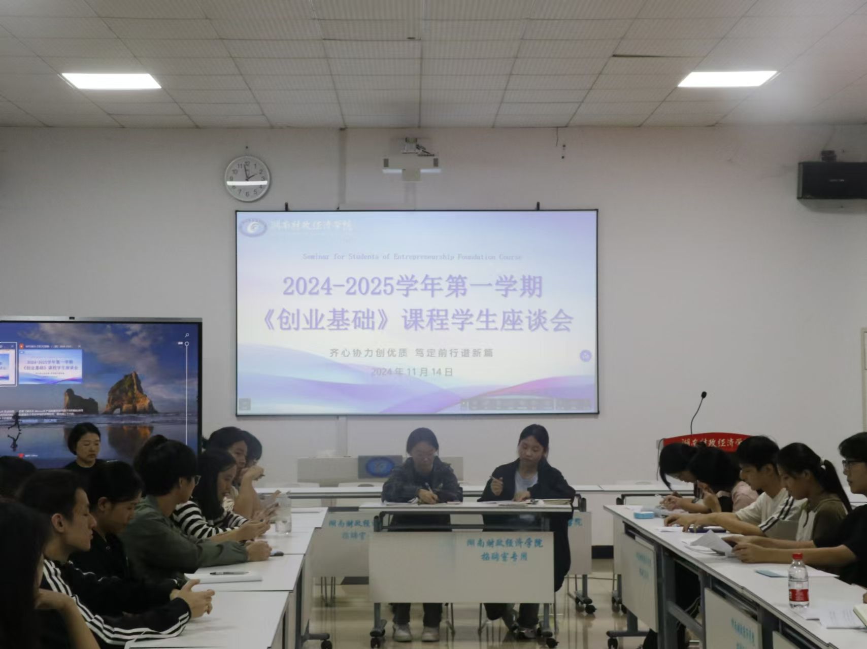 11月14日晚,best365官网就业创业中心在体育馆一楼多媒体招聘室召开了《创业基础》课程学生座谈会,会议由大学生创新创业指导教研室负责人周雪主持,2023级各班学生代表参会。