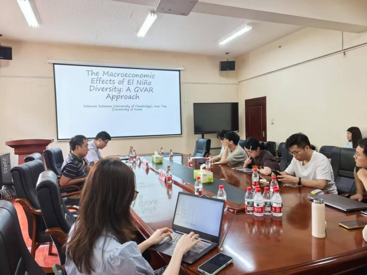 首先,田堃教授围绕“基于GVAR方法的厄尔尼诺现象多样性的宏观经济效应研究”这一主题进行了分享,包括厄尔尼诺现象及其经济相关性、GVAR方法、关键结果、敏感性分析、稳健性检验和政策建议等。环境经济学是近年来的热点话题,田教授的分享具有启发性,为大家打开了新的研究思路。接下来,参会的教师踊跃提问,田堃教授耐心地进行了一一解答。