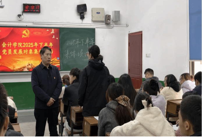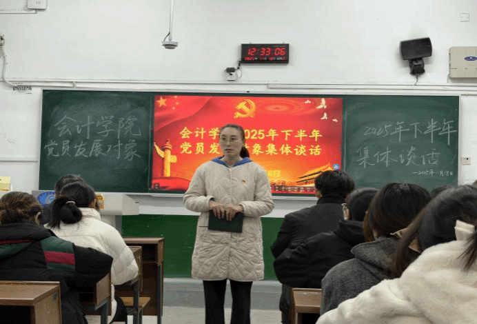 (本网讯)为切实加强对新发展学生党员的教育管理,引导其坚定理想信念、端正入党动机、充分发挥先锋模范作用,11月18日,受上级党委指派,会计学院党委书记戴恩湘、党委副书记肖芳在第一教学楼1102教室与43名党员发展对象进行集体谈话。