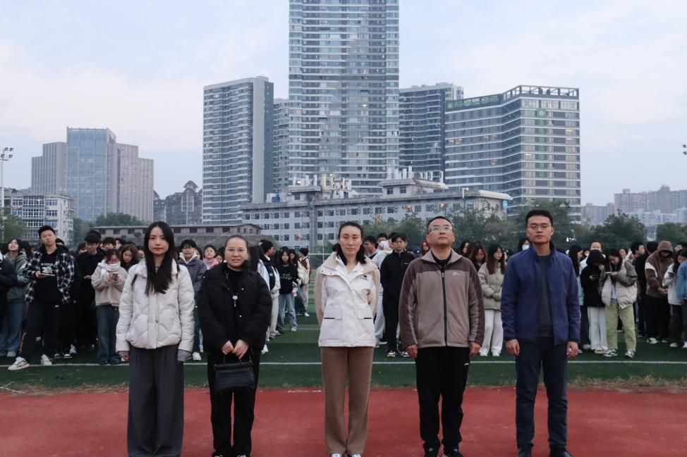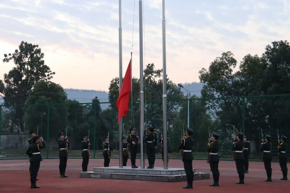 校国旗班同学们踏着矫健有力的步伐,护卫着鲜艳的五星红旗入场。他们的步伐整齐划一,姿态庄重肃穆,展现了当代大学生昂扬的精神风貌。当雄壮的国歌奏响,全场师生集体行注目礼,目光中充满了对祖国的热爱和敬仰,五星红旗在晨风中冉冉升起,那一抹鲜红点燃了在场每一个人心中的爱国热情。